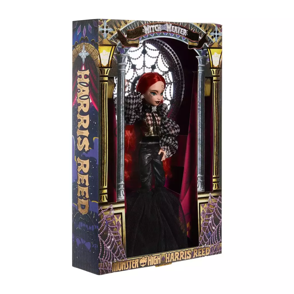 A Monster High fez uma parceria com o visionário estilista Harris Reed para criar uma boneca sombria e glamourosa que exala um estilo fascinante: a Bruxa Tecelã. Usando um chapéu de teia de aranha de cristal inspirado nos acessórios de cabeça característicos de Reed, a Bruxa Tecelã evoca a magia da alfaiataria com uma blusa transparente de arlequim e calças boca de sino pretas como a meia-noite. Capaz de conjurar feitiços benevolentes, esta bruxa encantadora capacita cada monstro a expressar seu verdadeiro eu — em qualquer forma que ele assuma.