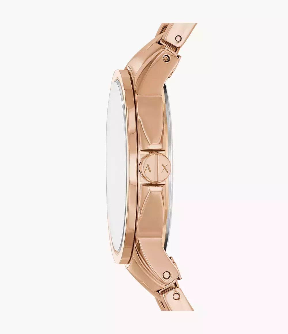 Um mostrador sunray em ouro rosa brilha neste irresistível relógio feminino da Armani Exchange. O relógio é finalizado com uma caixa em tom de ouro rosa e pulseira H-link.
