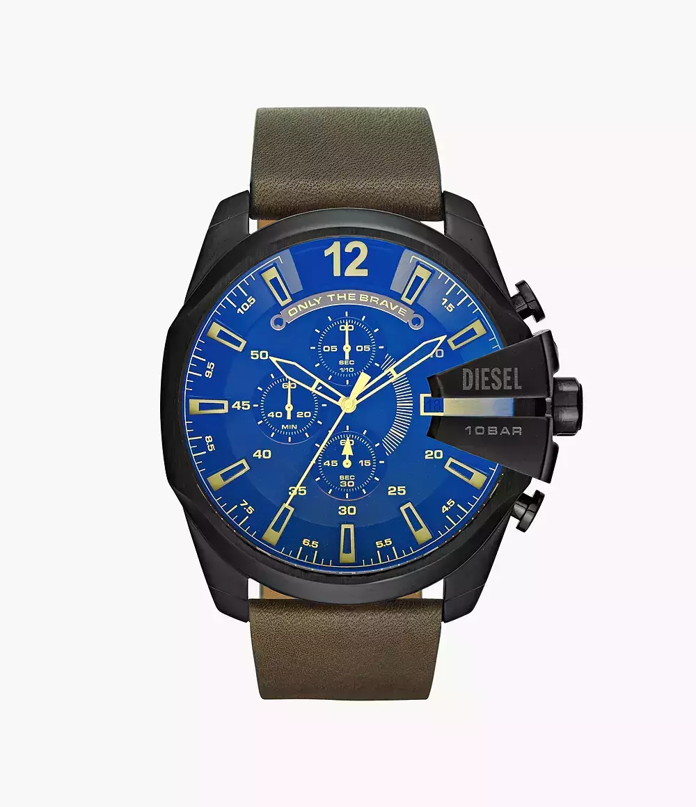 Seja um líder, não um seguidor, com o relógio Diesel Mega Chief em aço inoxidável e couro marrom. O mostrador cronógrafo azul ousado apresenta índices prateados e a etiqueta "Only the Brave", finalizada com um cristal iridescente.